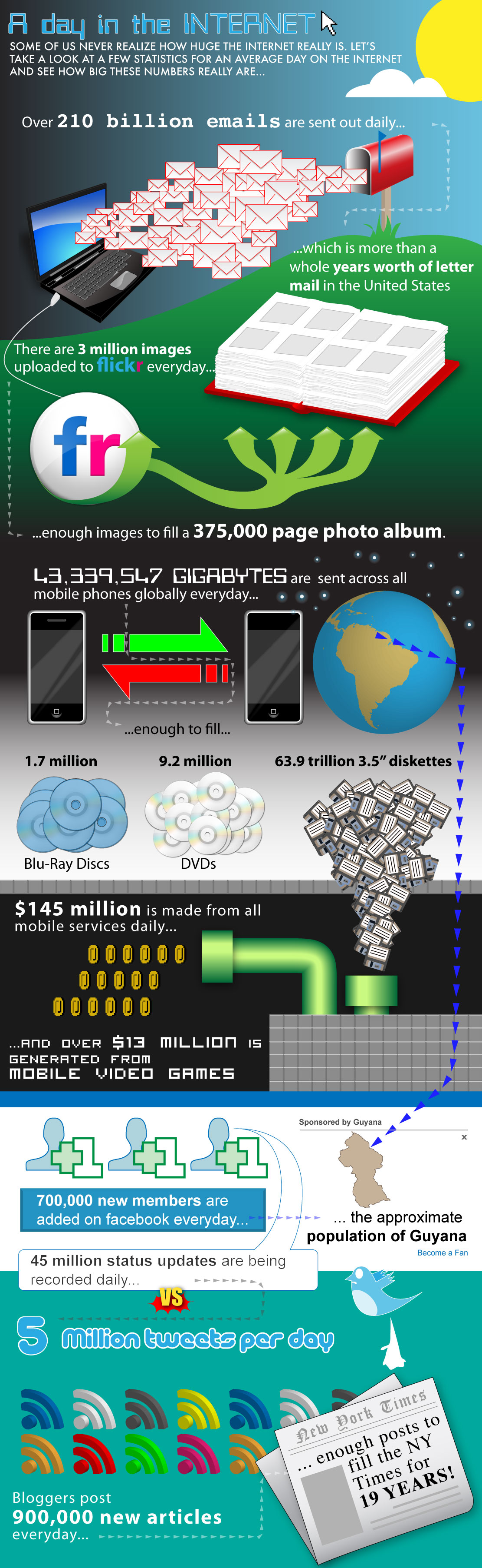 Voilà un document qui aurait été pas mal pour montrer à mes étudiants le gigantisme d’internet. Cette illustration « A Day in the Internet » de Online Education illustre quelques chiffres d’une journée d’internet. Impressionnant !