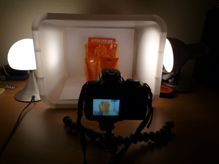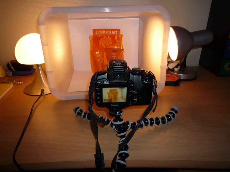 Le mini-studio est ici posé sur un bureau et j’ai utilisé mon pied Gorillapod pour caler l’appareil photo.
