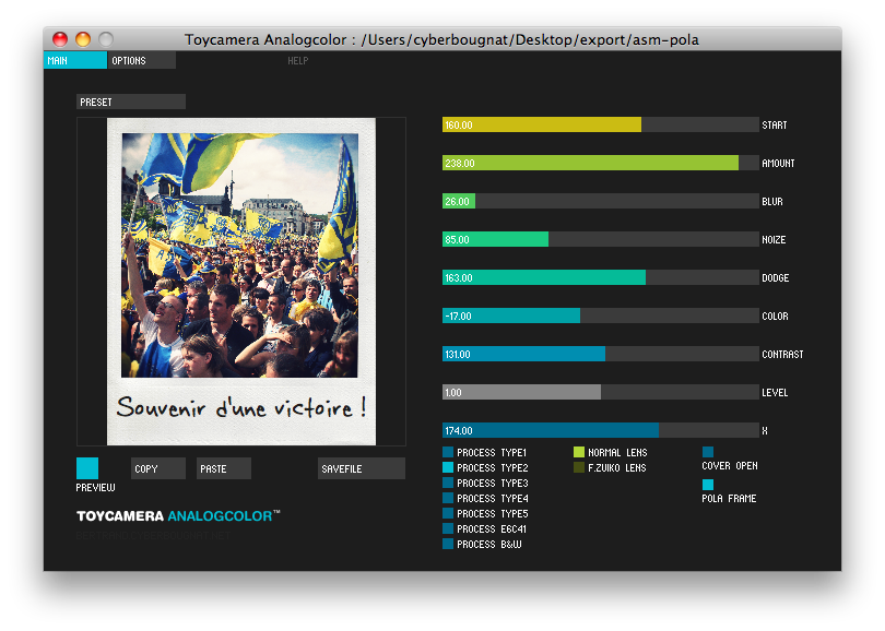 Voilà un petit logiciel amusant. Comme le font de nombreuses applications photos sur iPhone, ToyCamera AnalogColor se propose d’appliquer des effets de vieillissement sur des photos : traitements croisés des couleurs comme avec un Lomo, simulation du rendu obtenu avec les appareils photos plastiques, bruit, vignetage, ajout d’un cadre et notamment polaroid si vous le souhaitez.