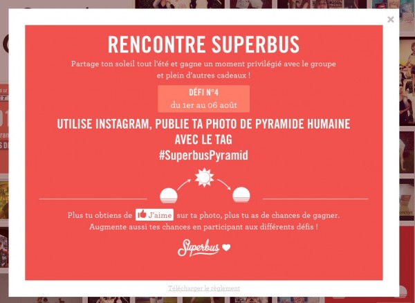 Le groupe Superbus a une utilisation importante d’internet pour faire sa promotion et lancer son nouvel album à la fin du mois. En ce moment le groupe fait participer ses fans avec un concours Instagram. Le site lance des défis à ses fans en utilisant Instagram et un hashtag approprié contenant à chaque fois le mot Superbus bien entendu. Plutôt sympa et très adapté à l’été.
