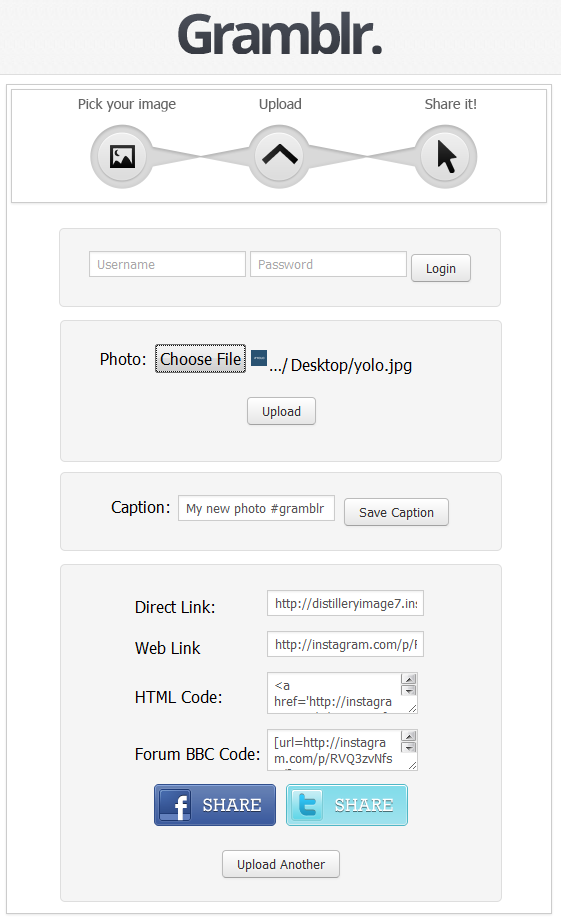 Voici une autre solution utilisant cette fois l’application Gramblr qui tourne à la fois sous Windows et sous Mac OSX. L’application est très simpliste. Une fois identifié, vous ajoutez une photo, puis saisissez votre légende et la photo est uploadée et l’application vous propose le lien vers la photo. Comme vous pouvez le voir sur ce test, la photo est bien publiée sous mon compte. Donc Gramblr a bien trouvé une astuce pour passer outre l’API, même si ce n’est peut être pas pour longtemps.